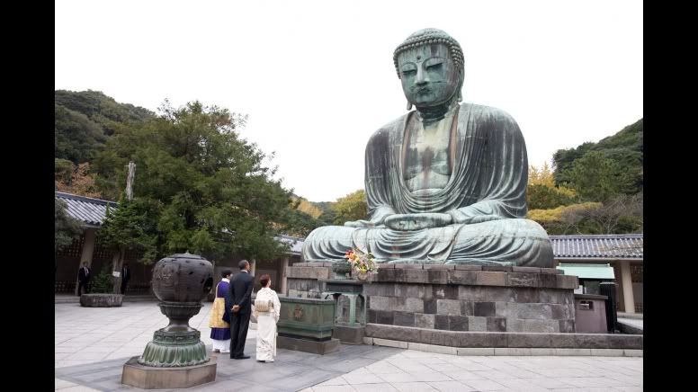 President Barack Obama visits the Great Buddha of Kamakura with Michiko Sato, director, and Dr. Takao Sato, Chief Monk, at the Kotoku-In Temple in Kamakura, Japan, Nov. 14, 2010.