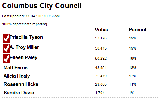 Two teabagger candidates for city council in Columbus, Ohio lost yesterday--Matt Ferris and Alicia Healy. They had targeted incumbent Democrats who had supported a city tax increase last August. The tax was aimed at covering a shortfall caused by the recession.